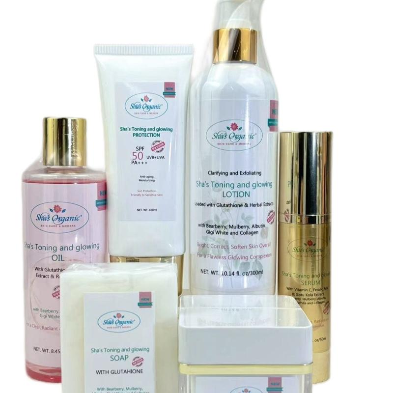 The new Improved Sha’s Toning and Glowing Skincare Package Set with SPF 50 Toner No Alcohol Moisturizes Serum Revitalizes Soap Brightening Glutathione Glycerin Jojoba Kit Shea Comfort Hydrate